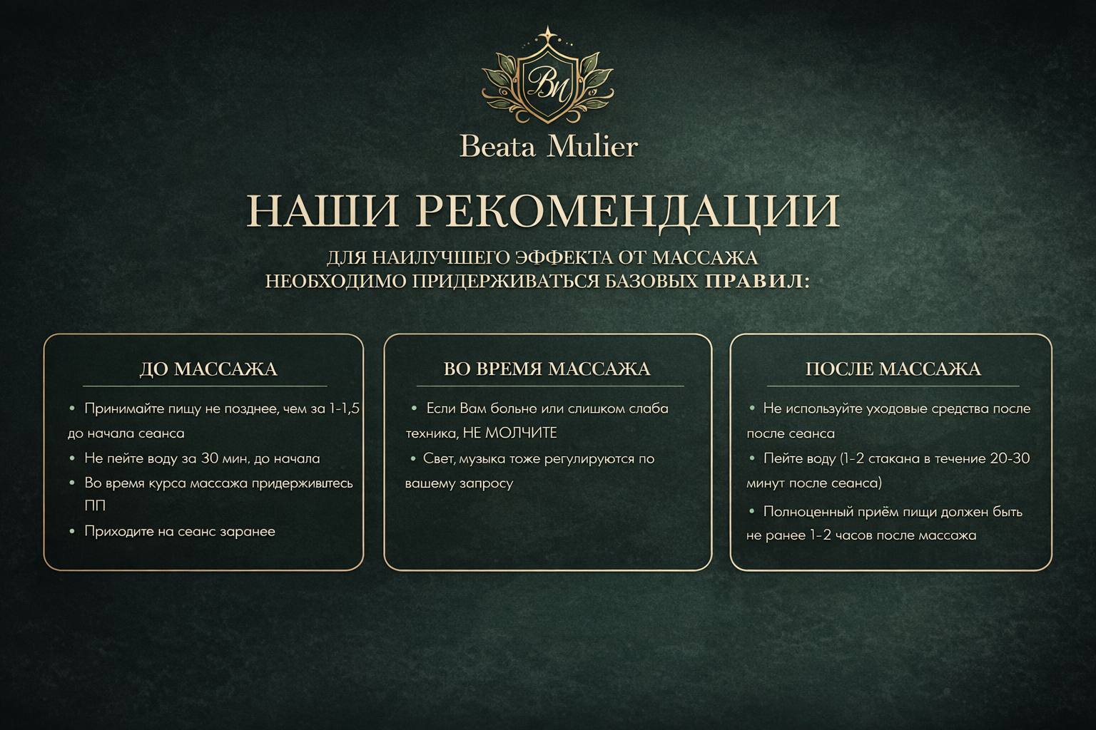 Beata Mulier — место, где каждый клиент чувствует себя особенным. Мы создаём атмосферу спокойствия и уюта, чтобы вы могли полностью расслабиться и восстановить силы в комфортной обстановке.